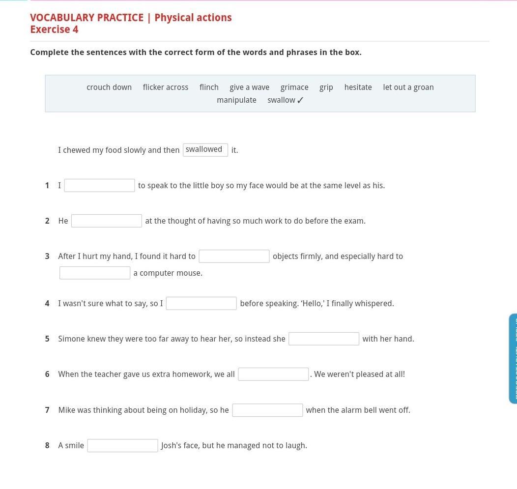1. crouch down 2. flinch 3. manipulate, grip 4. hesitate 5. give a five 6. grimace 7. let out a groan 8. flicker across. Извиняюсь если что-то неправильно...