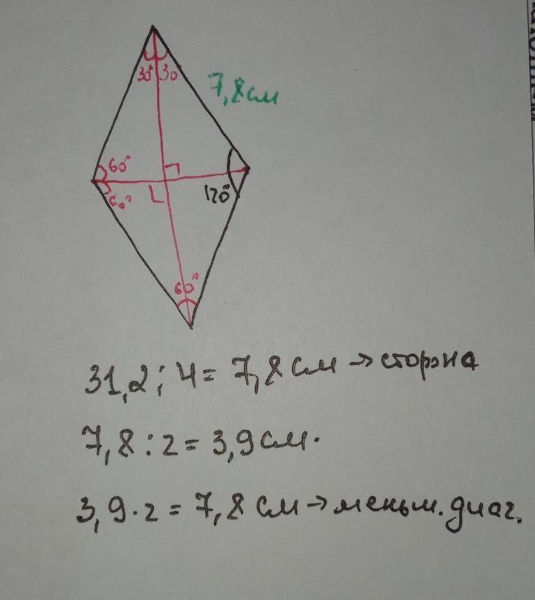 У нас у ромба стороны все равны, а значит Периметр если мы поделим на 4, то получим длину одной стороны.(7.8 м)