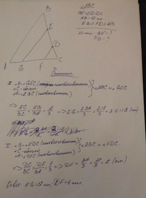 сторона АВ треугольника АВС равна 21 см. Сторона АС разделила на 3 равные части через точку деления проведены прямые парадедограмные стороны ВС.Найдите длинны отрезков этих прямых содержащих между сторонами треугольника