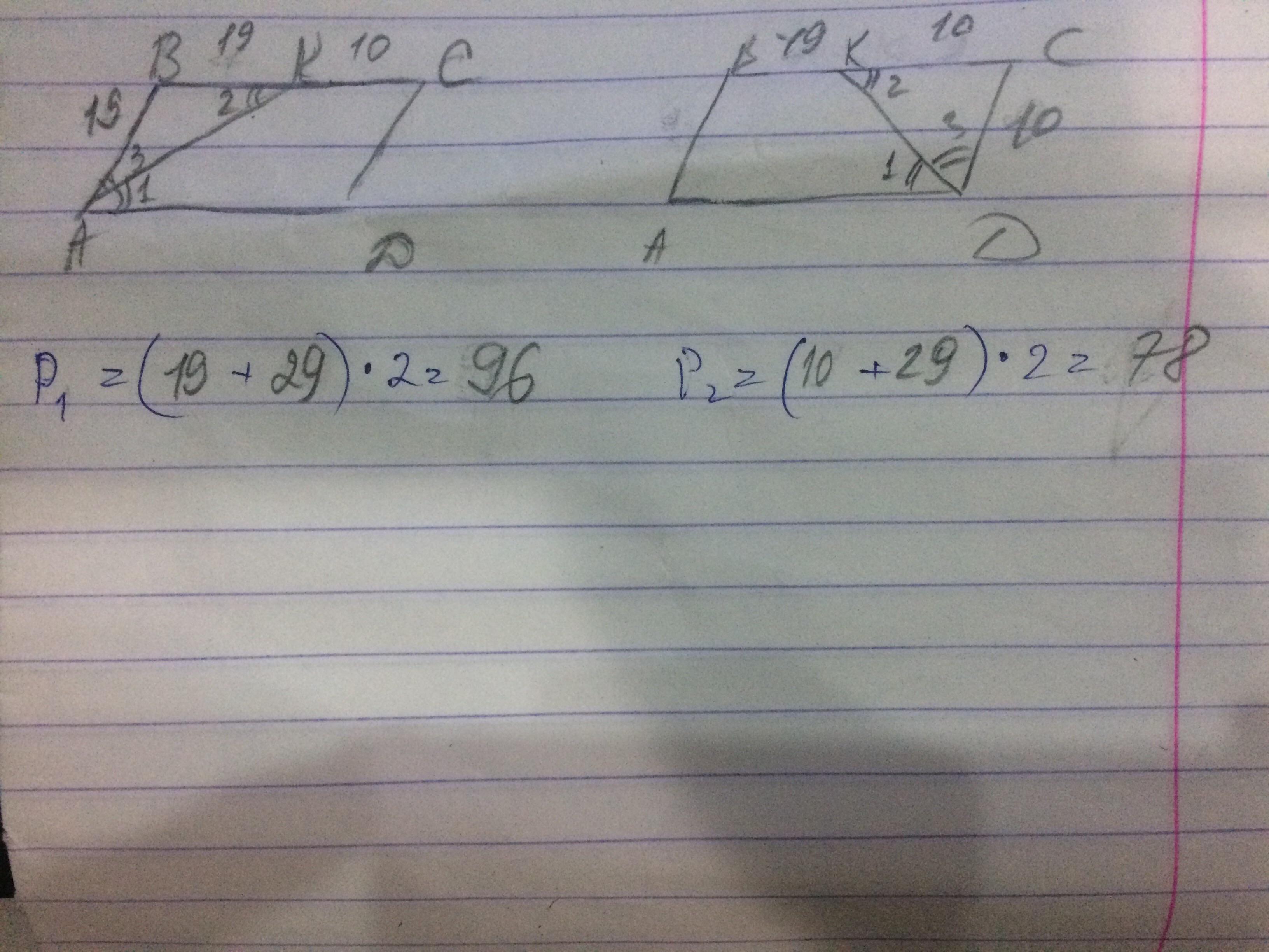 тогда уг 2=уг3 => треуг АВК–равнобед =>АВ=ВК=19 и =СD (как стороны парал);