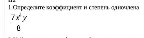 Коэффициент равен дроби 7/8 , степень одночлена равна 5, так как сумма показателей степеней переменных "х" и "у" равна 5=4+1 .