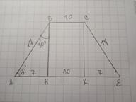 Проведем высоты ВН и СК. НК=ВС=10 см, АН+КЕ=24-10=14 см; АН=КЕ=14:2=7 см.