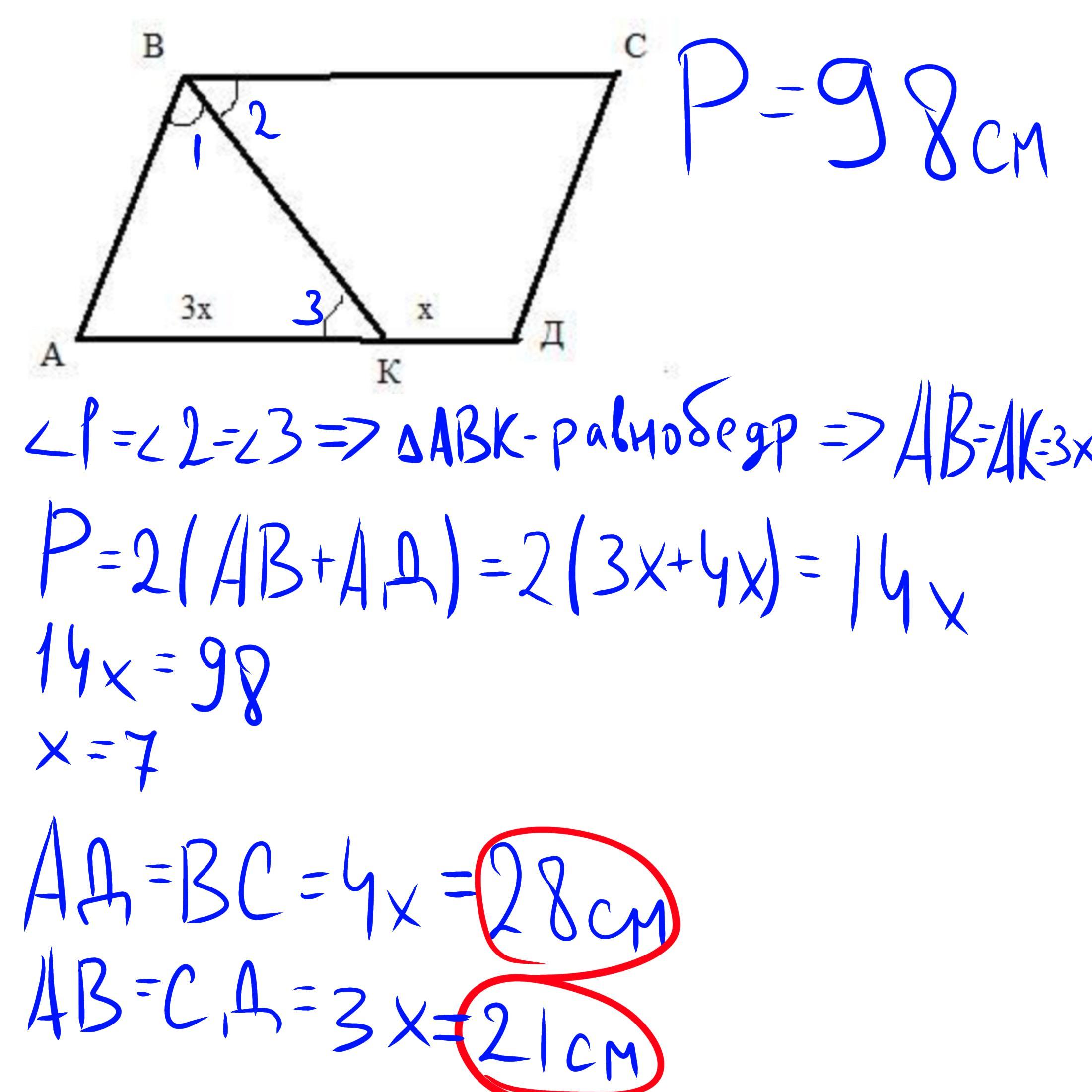 Биссектриса тупого угла B параллелограмма ABCD с периметром 98 см пересекает стену AD в точке K. КД: АК 1: 3. Найдите его стены.