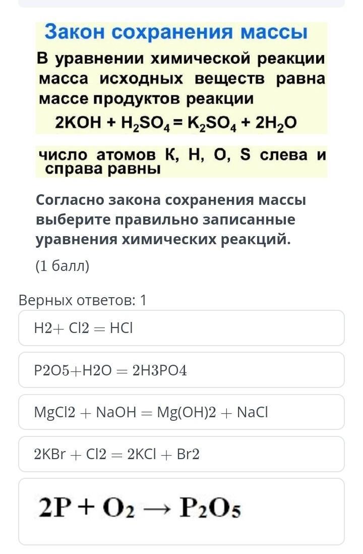 Согласно закона сохранения массы выберите правильно записанные уравнения химических реакций.