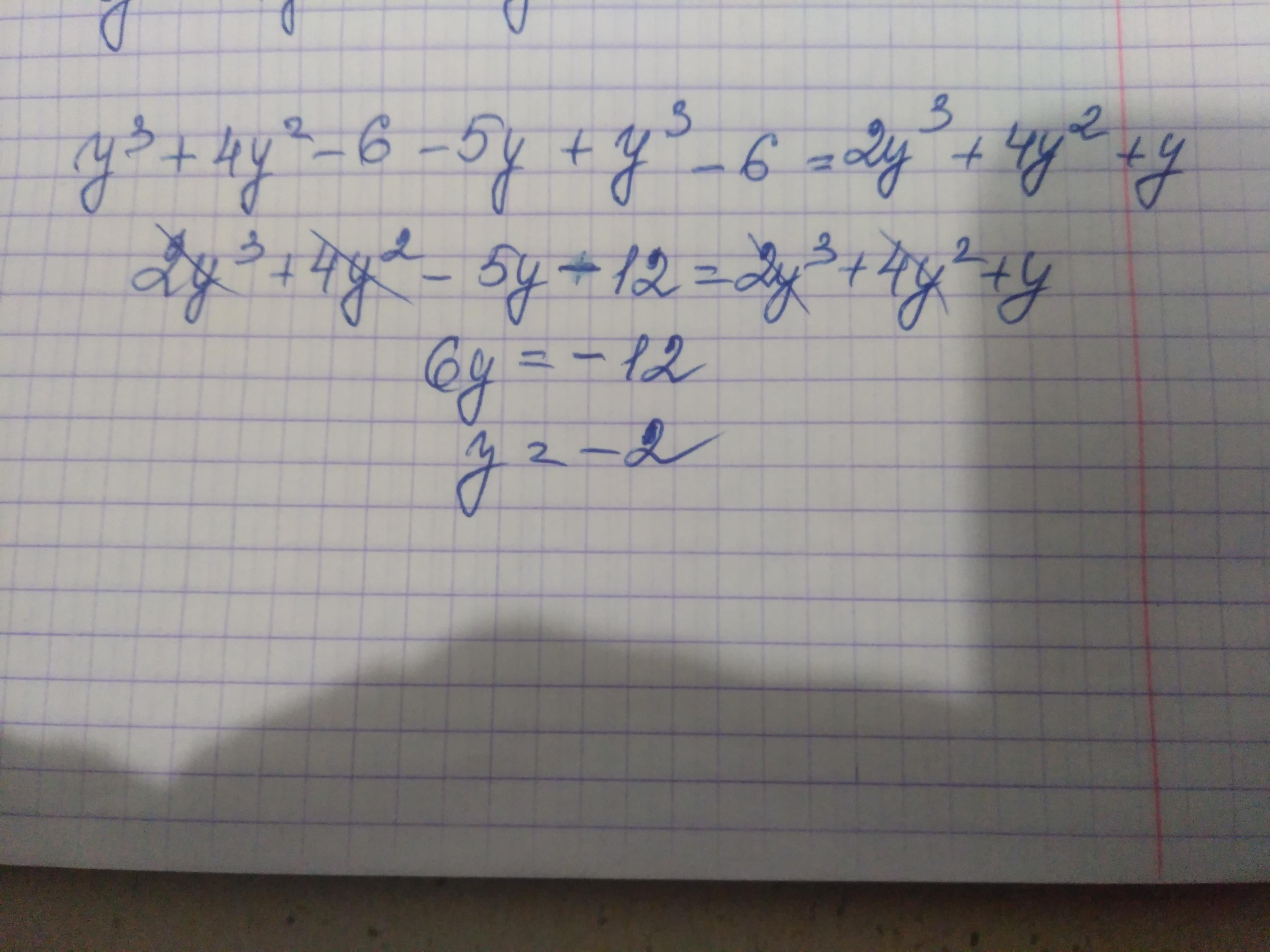 решите уравнение: (y^3+4y^2-6)-(5y-y^3+6)=2y^3+4y^2+y