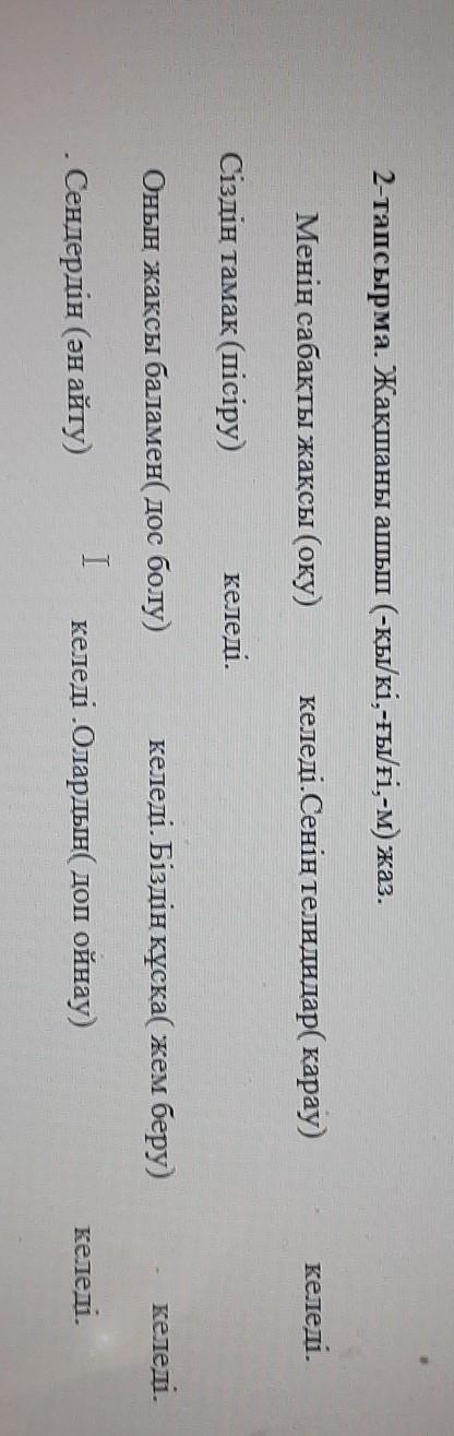 2-тапсырма. Жақшаны ашып (-қы/кі,-ғы/fi,-м) жаз.