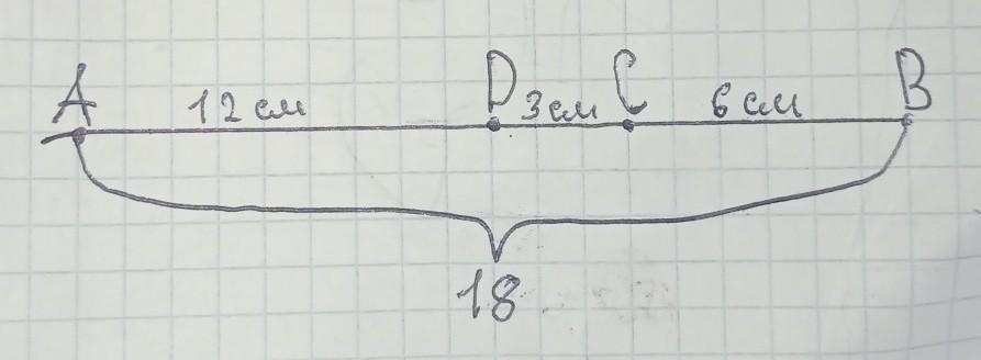 На прямой отложите отрезок АВ, отметьте точку D в середине этого отрезка. А также отметьте точку С на этом отрезке так, чтобы получились отрезки СА=12 см, СВ=6 см. Вычислите расстояние от точки С до точки D