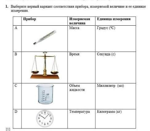 1. Выберите верный вариант соответствия прибора, измеряемой величине и ее единице измерения. Прибор Измеряемая величина Единица измерения A Масса Градус (0С) B Время Секунда (с) C Объем жидкости Миллилитр (мл) D Температура Килограмм (кг)