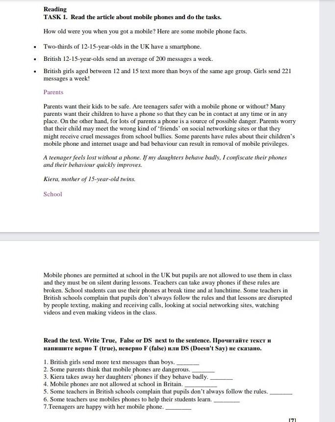 Read the text. Write True, False or DS next sentence 1 British girls send more text messages than boys и тд, ПОМОГИТЕ 7 класс соч