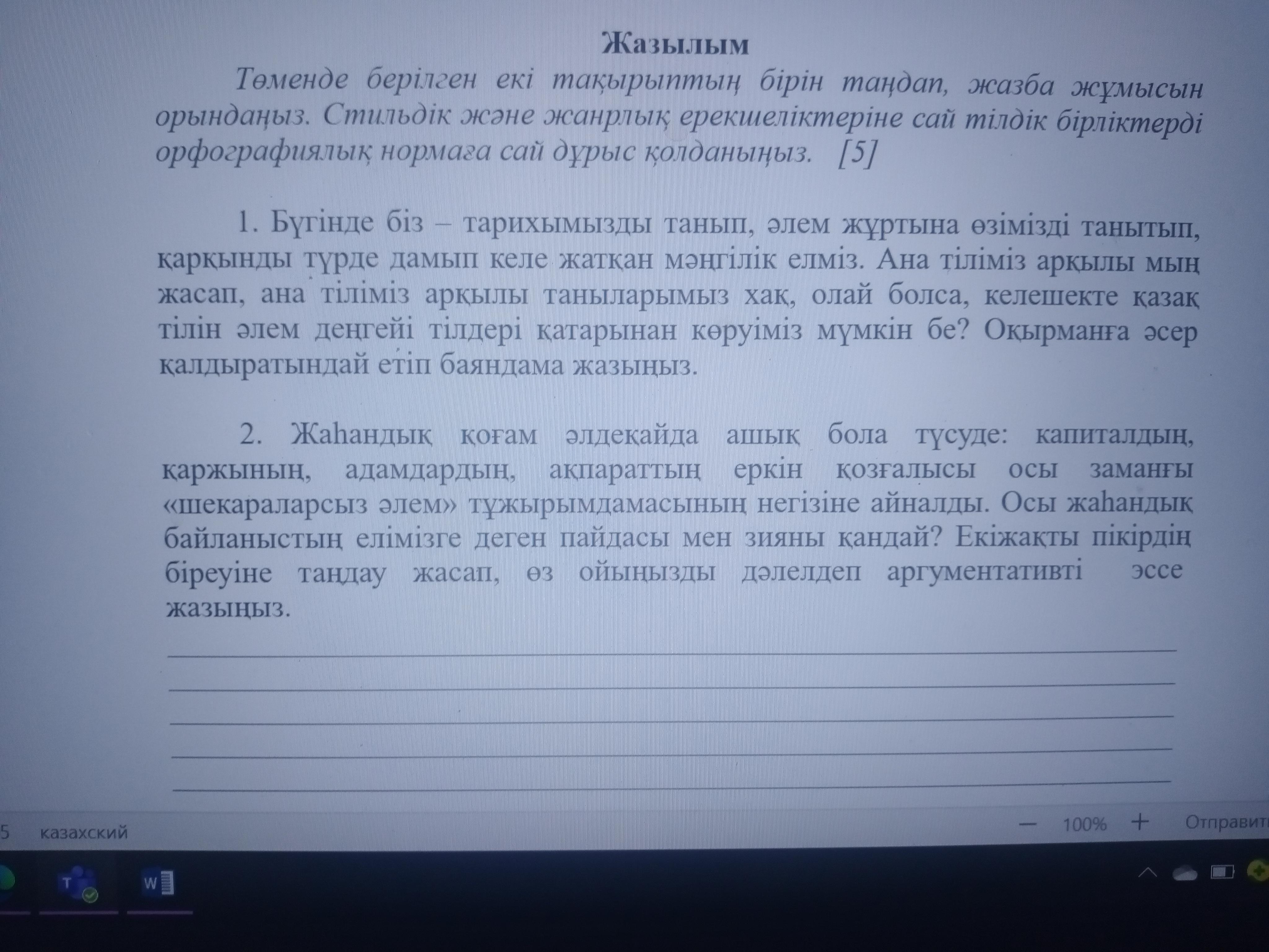 Төменде берілген екі тақырыптың бірін таңдап, жазба жұмысын орындаңыз. Стильдік және жанрлық ерекшеліктеріне сай тілдік бірліктерді орфографиялық нормаға сай дұрыс қолданыңыз