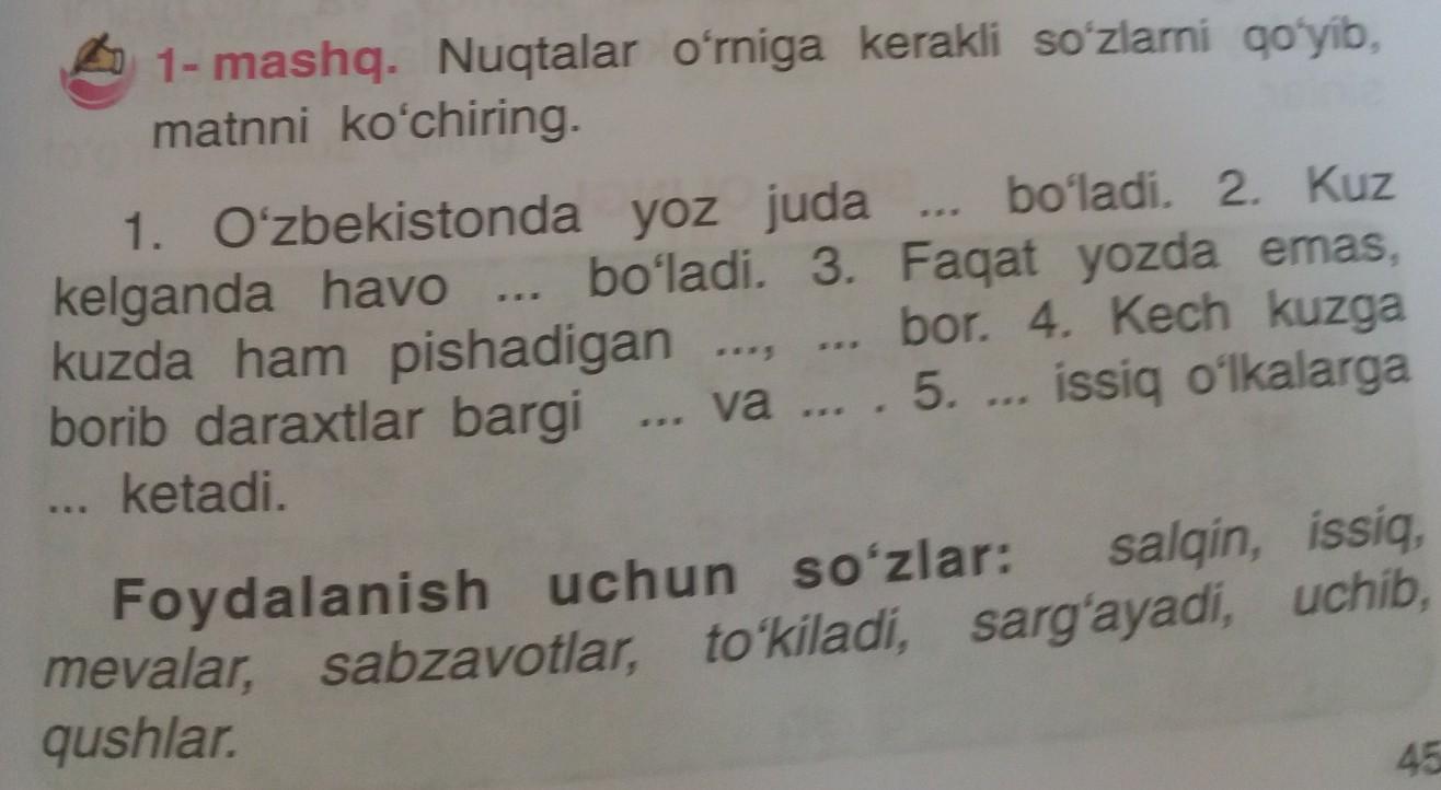1. Oʻzbekistonda yoz juda issiq boʻladi. 2. Kuz kelganda havo salqin boladi. 3. Faqat yozda emas , kuzda ham pishadigan mevalar , sabzavotlar bor. 4. Kech kuzga borib daraxtlar bargi sargʻayadi va toʻkiladi. 5. Qushlar issiq oʻlkalarga uchib ketadi.