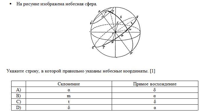 Укажите строку, в которой правильно указаны небесные координаты
