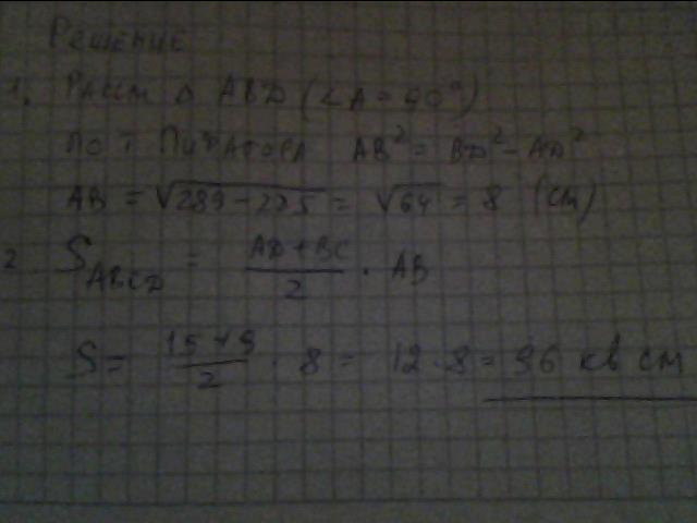 Так трапеция прямоугольная то находим по Т Пифагора высоту, она равна корень квадратный из ( 289-225)=8 см.