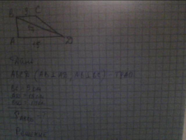 Большая диагональ прямоугольной трапеции равна 17 см ,а большее основание 15 см .Найдите площадь трапеции ,если ее меньшее основание равно 9 см