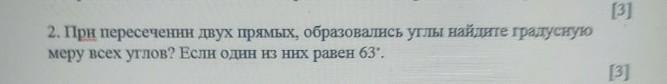 2. При пересеченнн двух прямых, образовались углы найдите градусную меру всех углов? Если однин из них равен 63'.