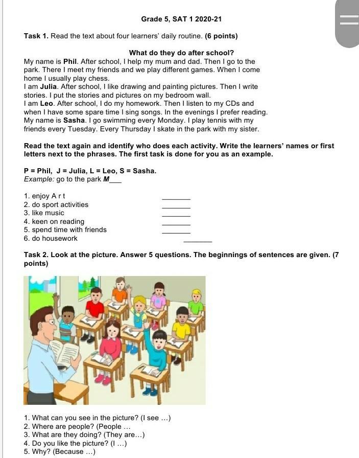 Task 2. Look at the picture. Answer 5 questions. The beginnings of sentences are given. (7 points)