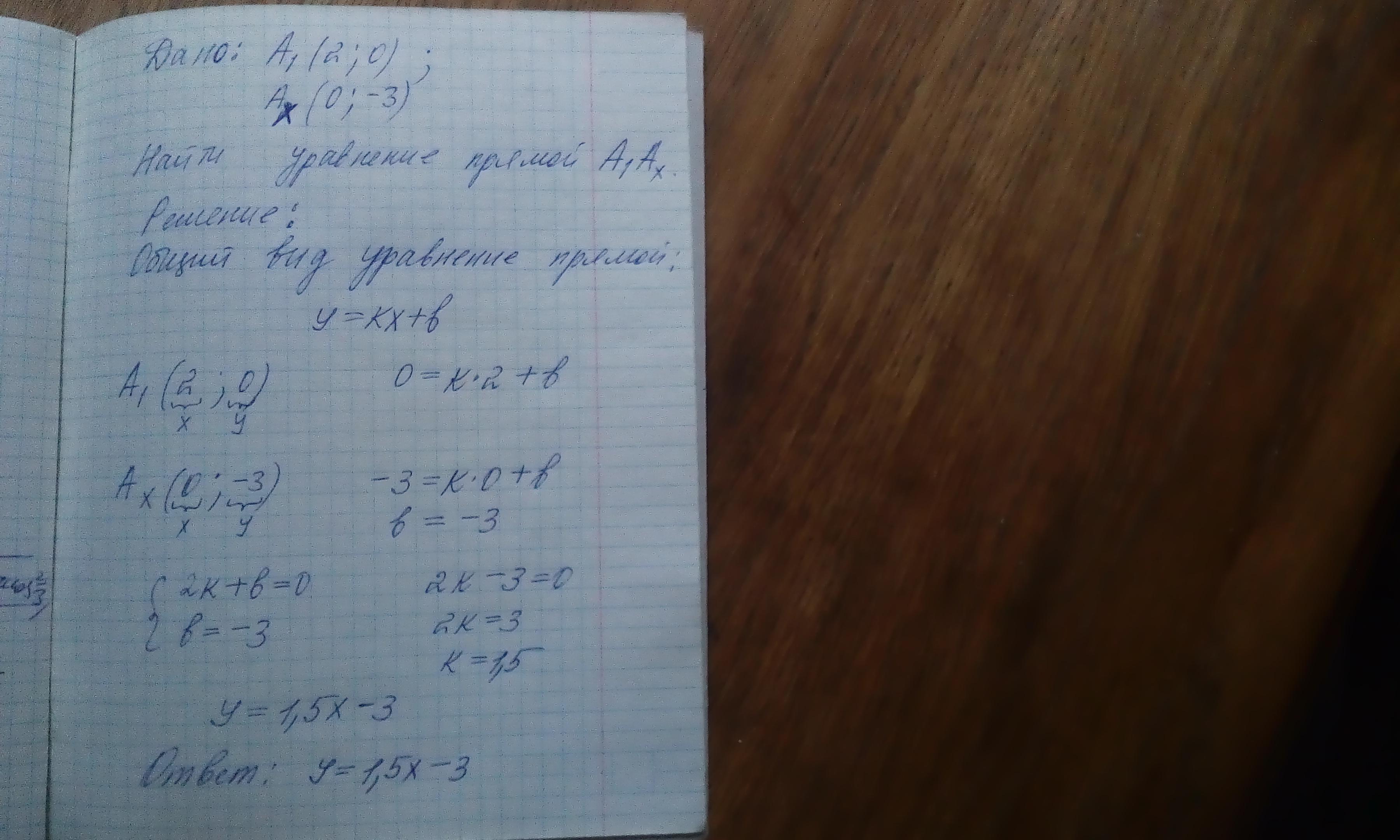 Найдите уравнение прямой, проходящее через точки А1(2; 0) и Ах(0; -3) Пожалуйста помогите срочно дано решение найти все нужно!!!