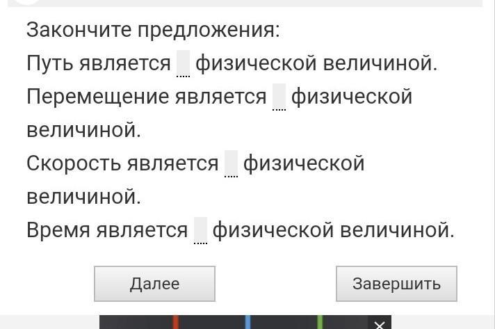 путь является скалярной физ.величиной. перемещение является скалярной физ.вел.скорость является векторной физ.вел. время является скалярной вел.