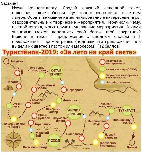 Изучи концепт-карту. Создай связный сплошной текст, описывая, какие события ждут твоего сверстника в летнем лагере. Обрати внимание на запланированные интересные игры, оздоровительные и творческие мероприятия. Перечисли, чему, на твой взгляд, могут научить указанные мероприятия. Какими знаниями может пополнить свой багаж твой сверстник? Включи в текст 1 предложение с вводным словом и 1 предложение с прямой речью (подпиши эти предложения или выдели их цветной пастой или маркером). (12 баллов)