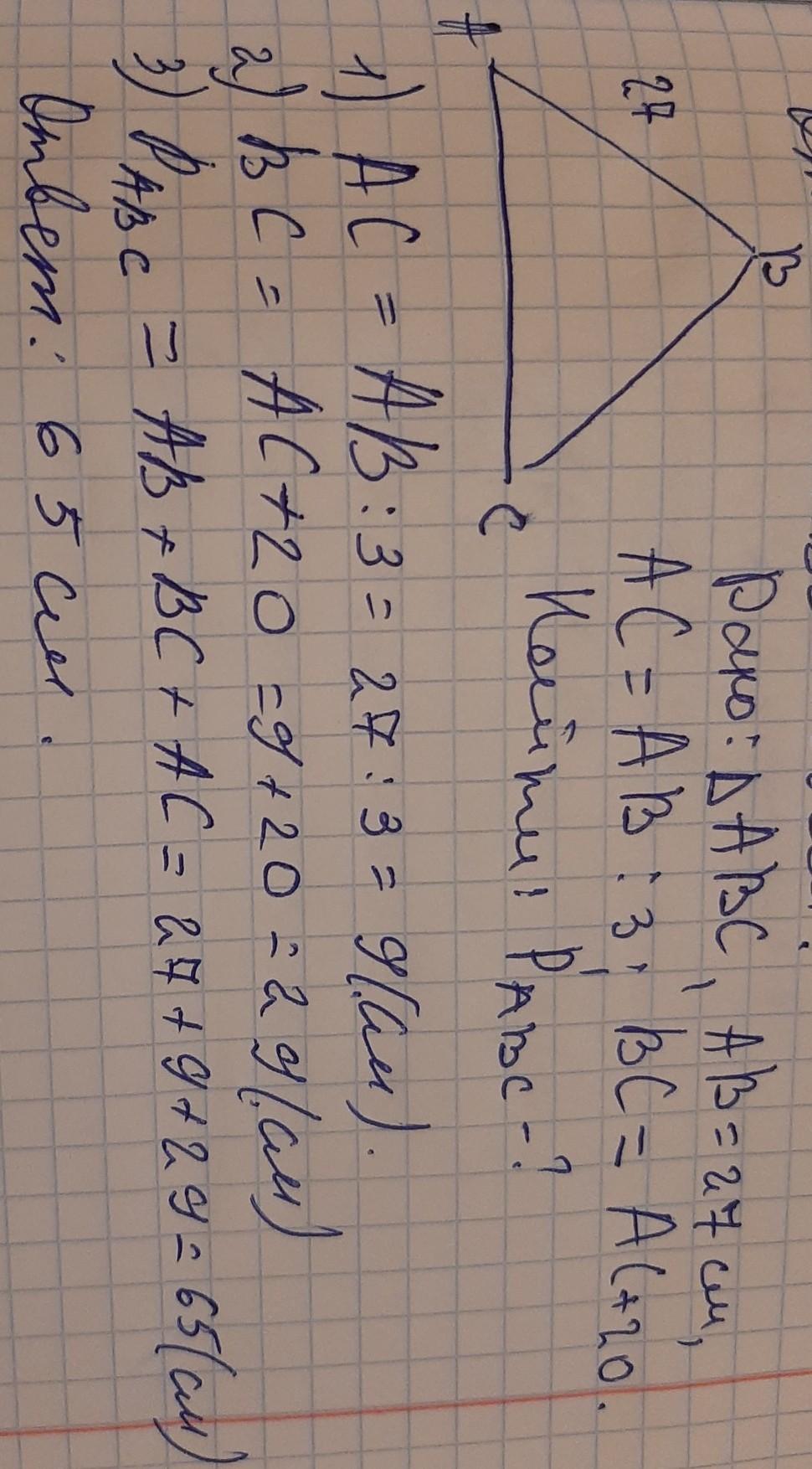 сторона AB треугольника ABC равна 27 см Сторона АС второе Короче стороны ab, а сторона BC на 20см больше чем сторона AC найдите Найдите периметр треугольника ABC геометрия
