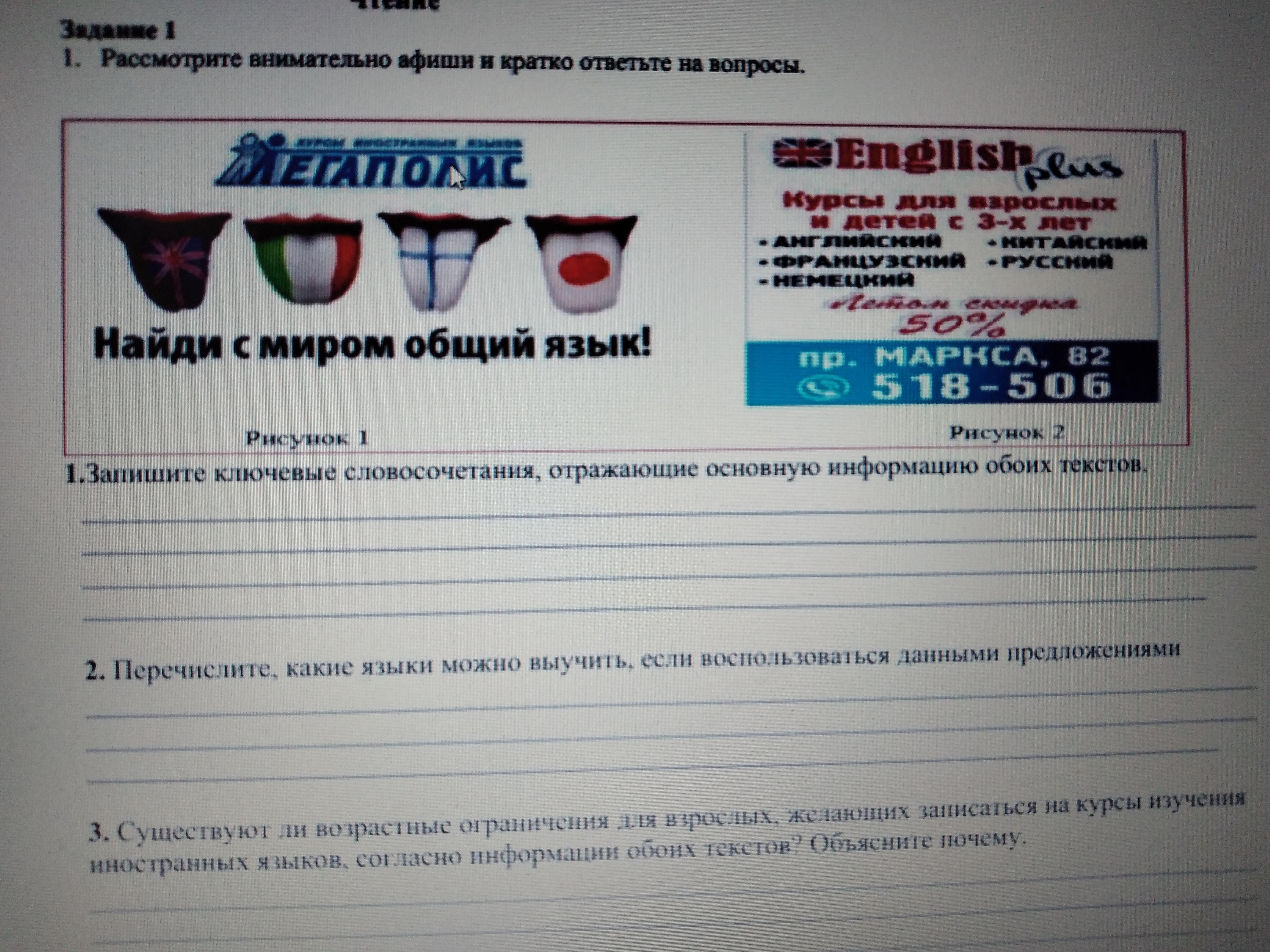 1. Запишите ключевые словосочетания, отражающие основную информацию обоих текстов. 2. Перечислете, какие языки можно выучить, если воспользоваться данными предложениями. 3. Существует ли возрастные ограничения для взрослых, желающих записаться на курсы изучения иностранных языков, согласно информации обоих текстов? Объясните почему. 4. Какие преимущества, согласно текстам, открываются перед людьми, знающими несколько языков. 5. Сформулируйте заголовок отражающий тему обоих текстов.