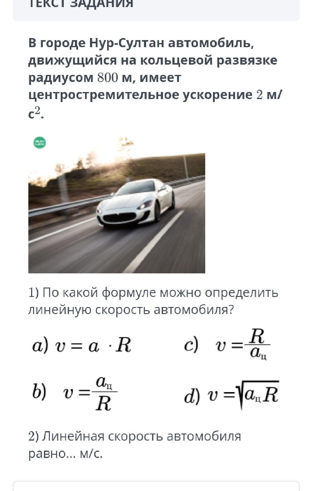 В городе Нур-Султан автомобиль движущийся на кольцевой развязки радиусом 800 м имеется центростремительное ускорение 2 м/с^2