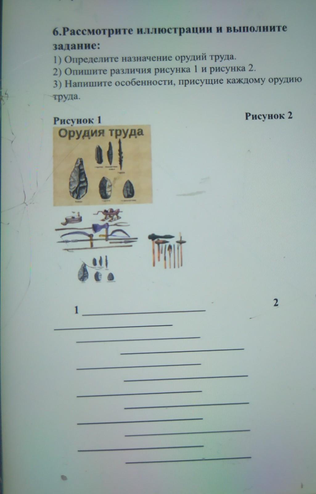 На первом рисунке изображены орудия труда палеолита. Это скребок рубило наконечник копья гарпун остроконечник и скребло .