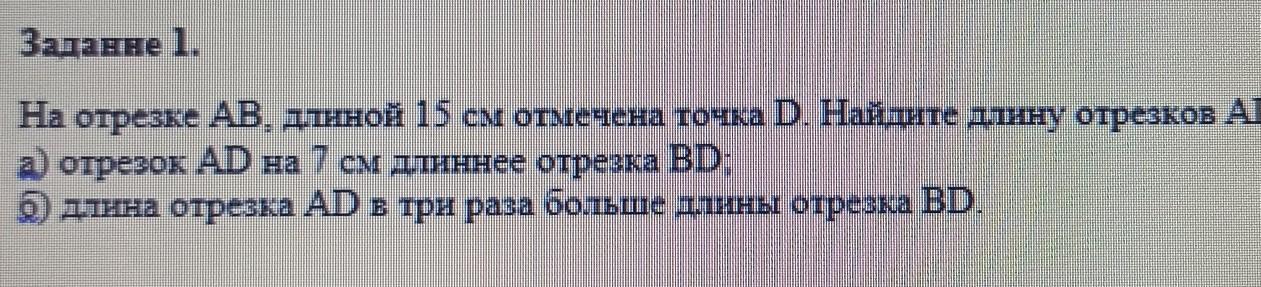 На отрезке AB, длиной 15 см отмечена точка D. Найдите длину отрезков AD и BD, если