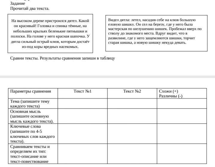 Название дятел,дятел,основная мысль о дятле , первый текст описание,второй повествование