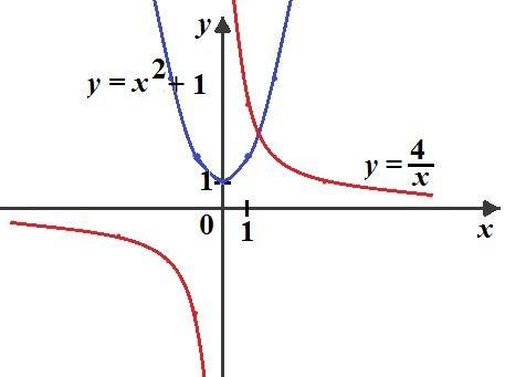 Графиком функции y = x^2 + 1 является парабола (на чертеже изображена синим цветом) , графиком функции y = 4/x является гипербола (на чертеже - красным цветом) . Два графика пересекаются в единственной точке с координатами (1,4; 2,9).