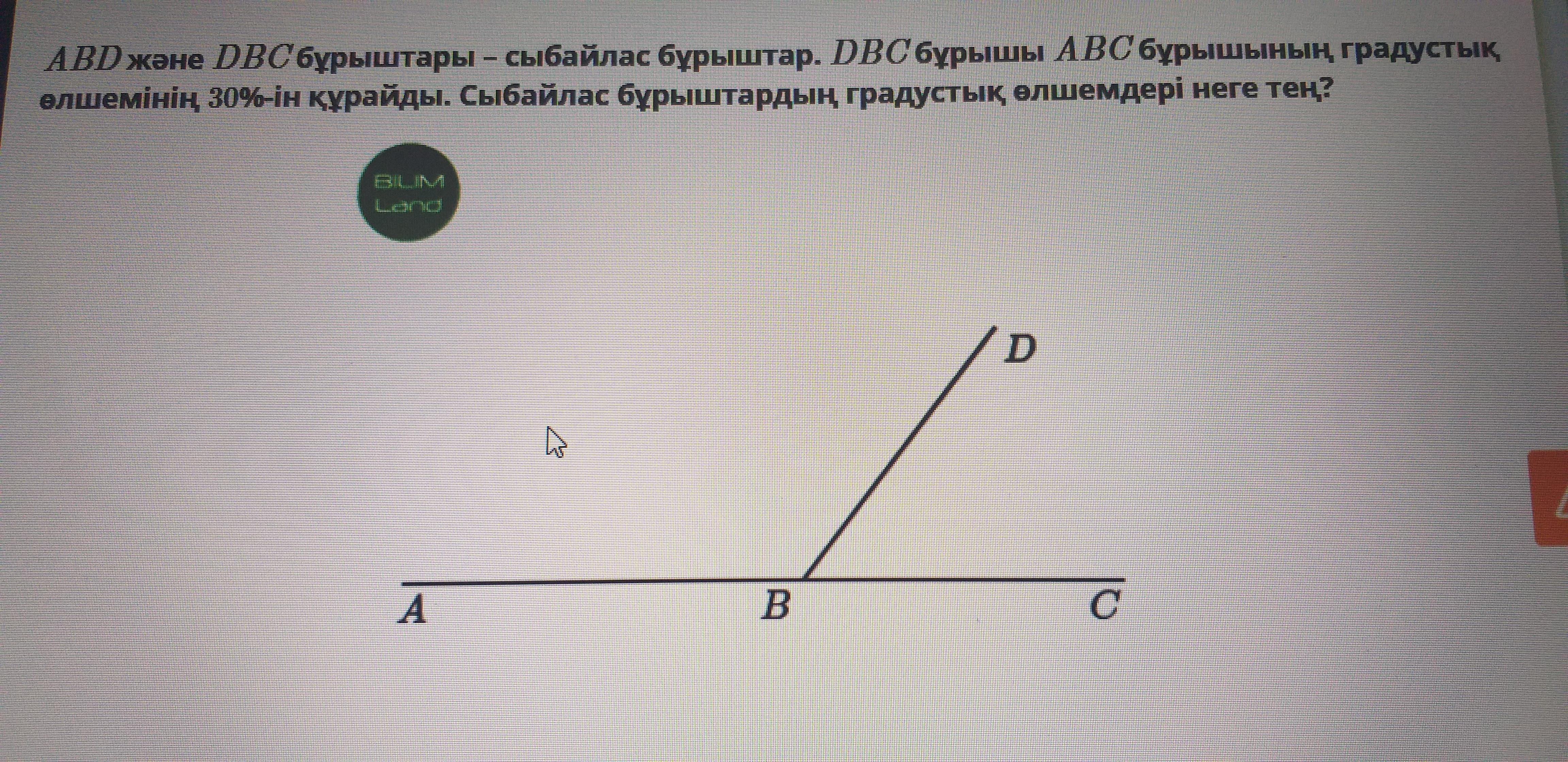 Углы ABD и DBC являются коррумпированными углами. Составляет 30% от градусного размера угла DBC. Чему равны градусные размеры углов?