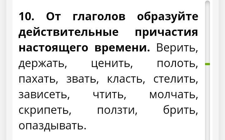 Верящий, держащий, ценящий, полющий, пашущий, зовущий, кладущий, стелющий, зависящий, чтущий, молчащий, скрипящий, ползущий, бреющий, опаздывающий