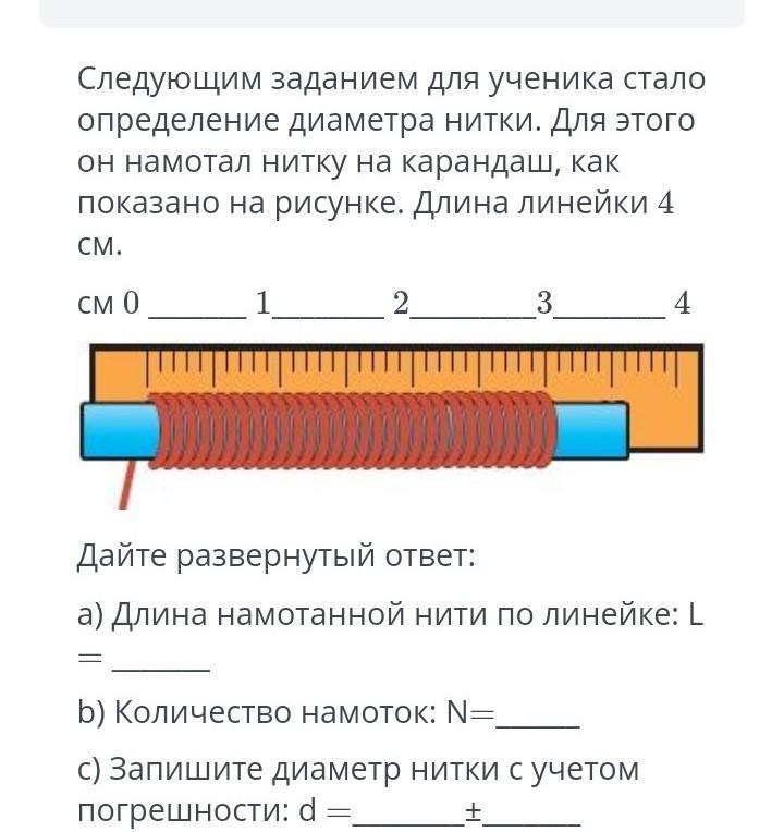 Следующим заданием для ученика стало определение диаметра нитки. Для этого он намотал нитку на карандаш, как показано на рисунке. Длина линейки 4см.