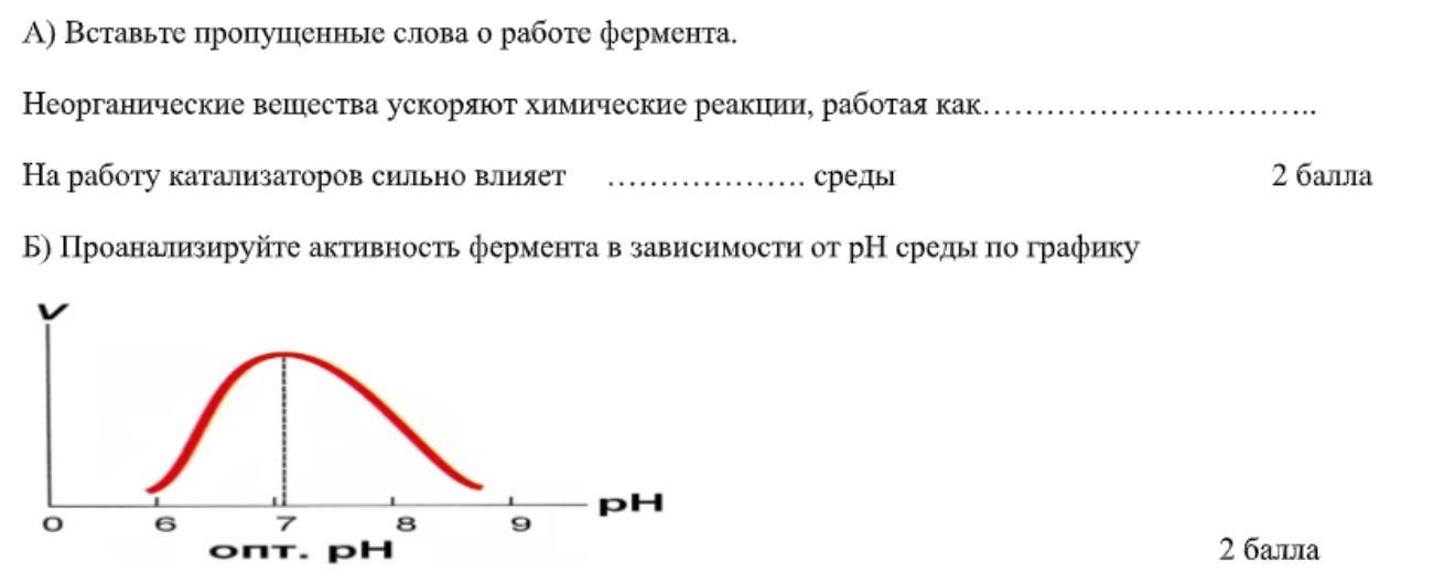 Вставьте пропущенные слова о работе фермента. Проанализируйте активность фермента в зависимости от рН среды по графику