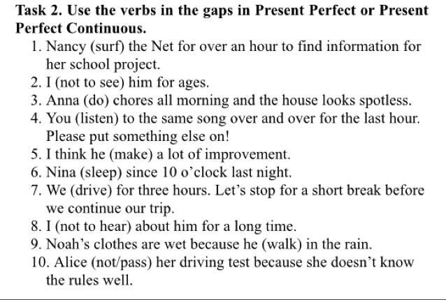 Task 2. Use the verbs in the gaps in Present Perfect or Present Perfect Continuous.