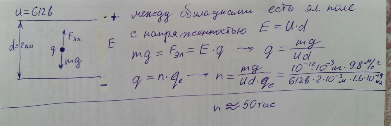 Отрицательно заряженная пылинка находится во взвешенном состоянии (в равновесии) между двумя горизонтальными равномерно заряженными пластинами, расстояние между которыми равно 1 см, а разность потенциалов 100В. Под воздействием ультрафиолетового излучения пылинка частично теряет заряд и выходит из состояния равновесия. Сколько электронов потеряла пылинка, если для восстановления равновесия потребовалось увеличить разность потенциалов на пластинах на 50В? Масса пылинки равна 4,9*10^-12 г.