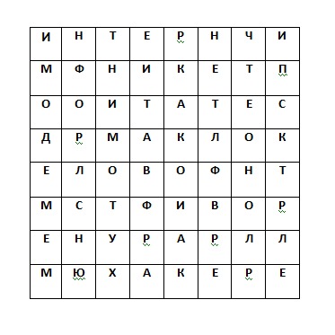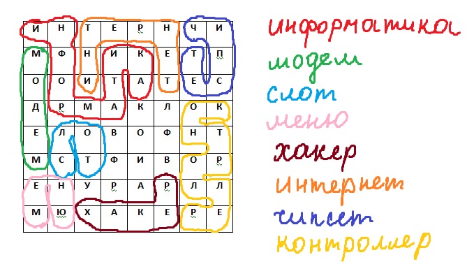 Дан файнворд, в котором закодированы некоторые термины по информатике.Необходимо их все найти и записать полученные слова.