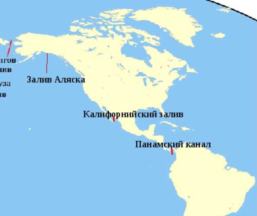 обозначьте на контурной карте Тихого океана крупнейшие заливы: Аляскинский залив, Панамский залив, Калифорнийский залив