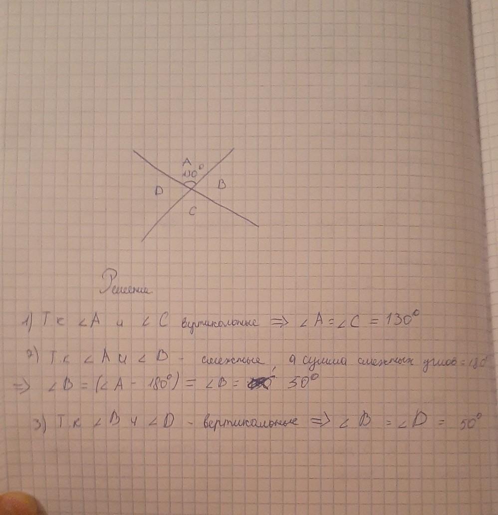 при пересечении двух прямых образовались углы Найдите градусные меры всех углов если один из них равен 130 градусов