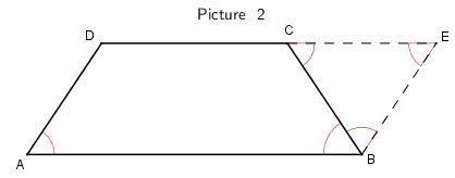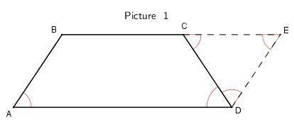 2) Из вершины D продлим сторону до пересечения на продлении стороны BC, так что AB ║ DE, т.е. ABED — параллелограмм.