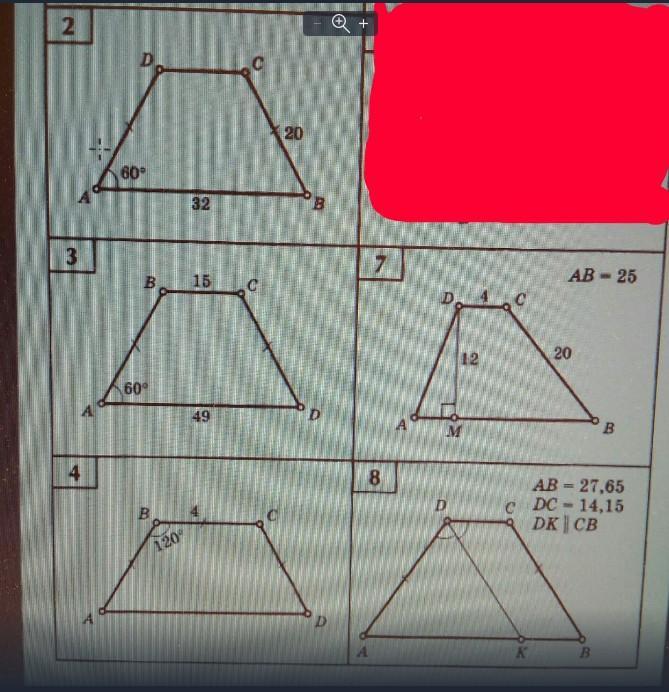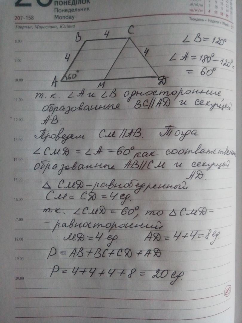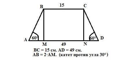 Меньшее основание ВС=15 см. Большее основание AD=49 см. Острые углы D=A=60° (трапеция равнобедренная).