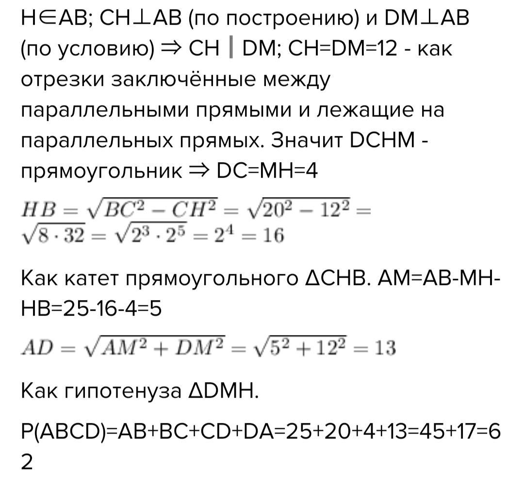 Теперь известны все стороны трапеции АВ=СD=34см, ВС=15см, АD=49см.