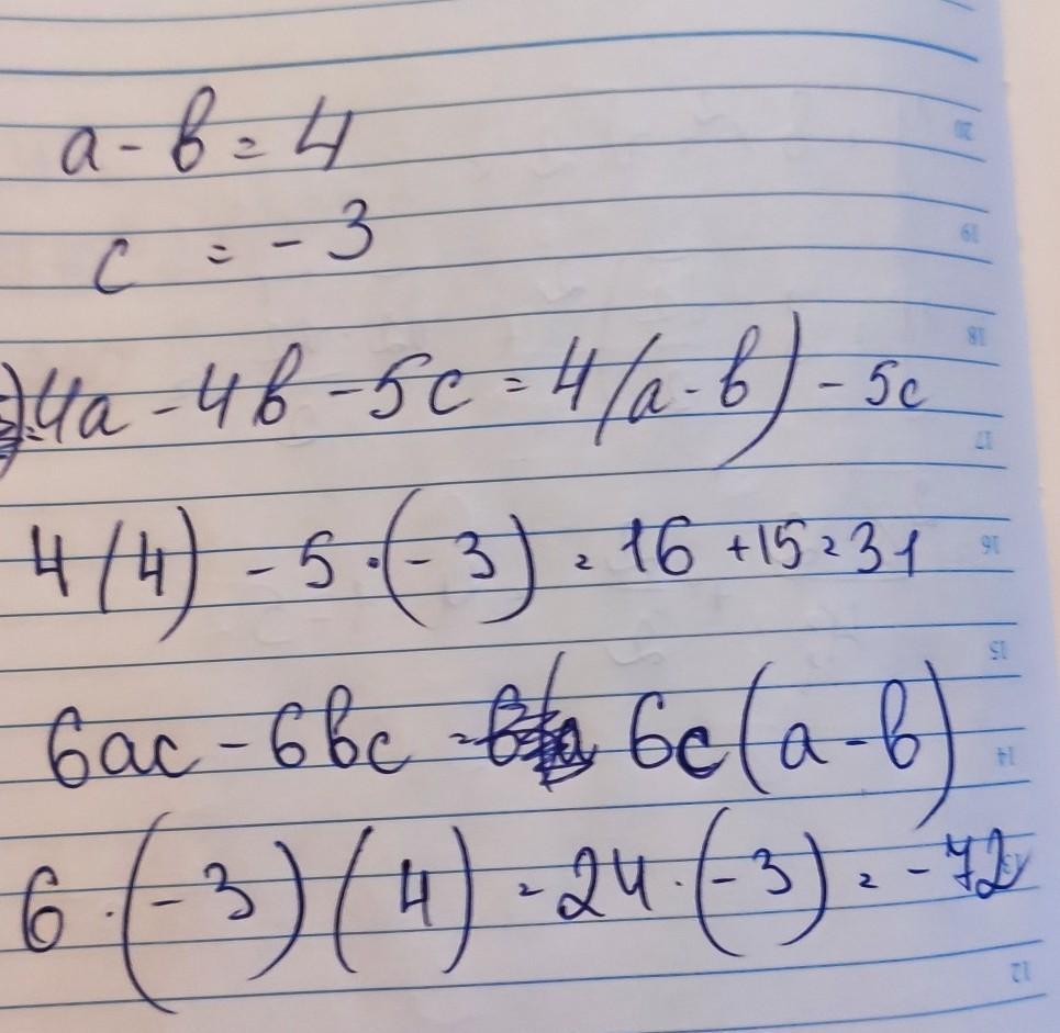 Значения переменных а и b таковы, что a-b=4,c=-3. Найдите значение выражения.