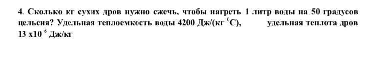 Пожалуйста, срочно. Сколько кг сухих дров нужно сжечь чтобы нагреть 1 литр воды на 50 градусов Цельсия.?