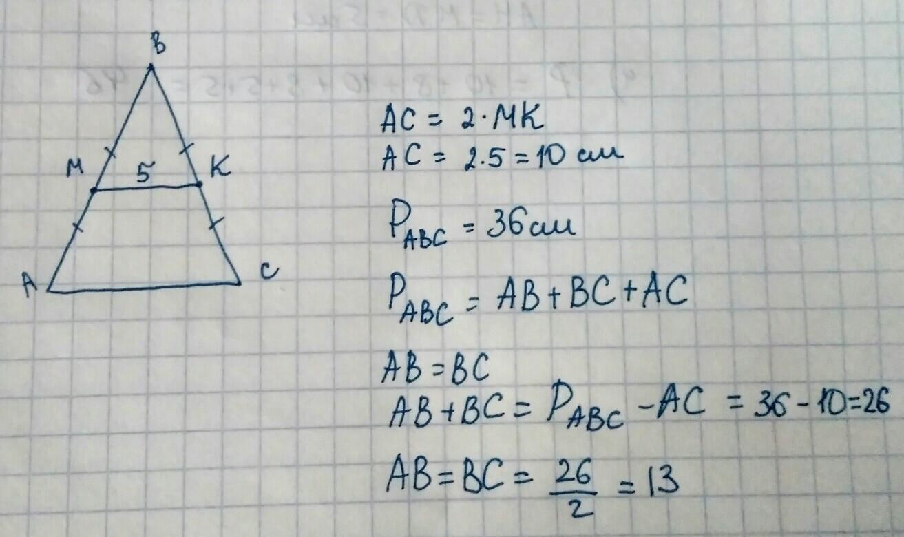 5.Средняя линия равнобедренного треугольника, параллельная основанию, равна 5 см.