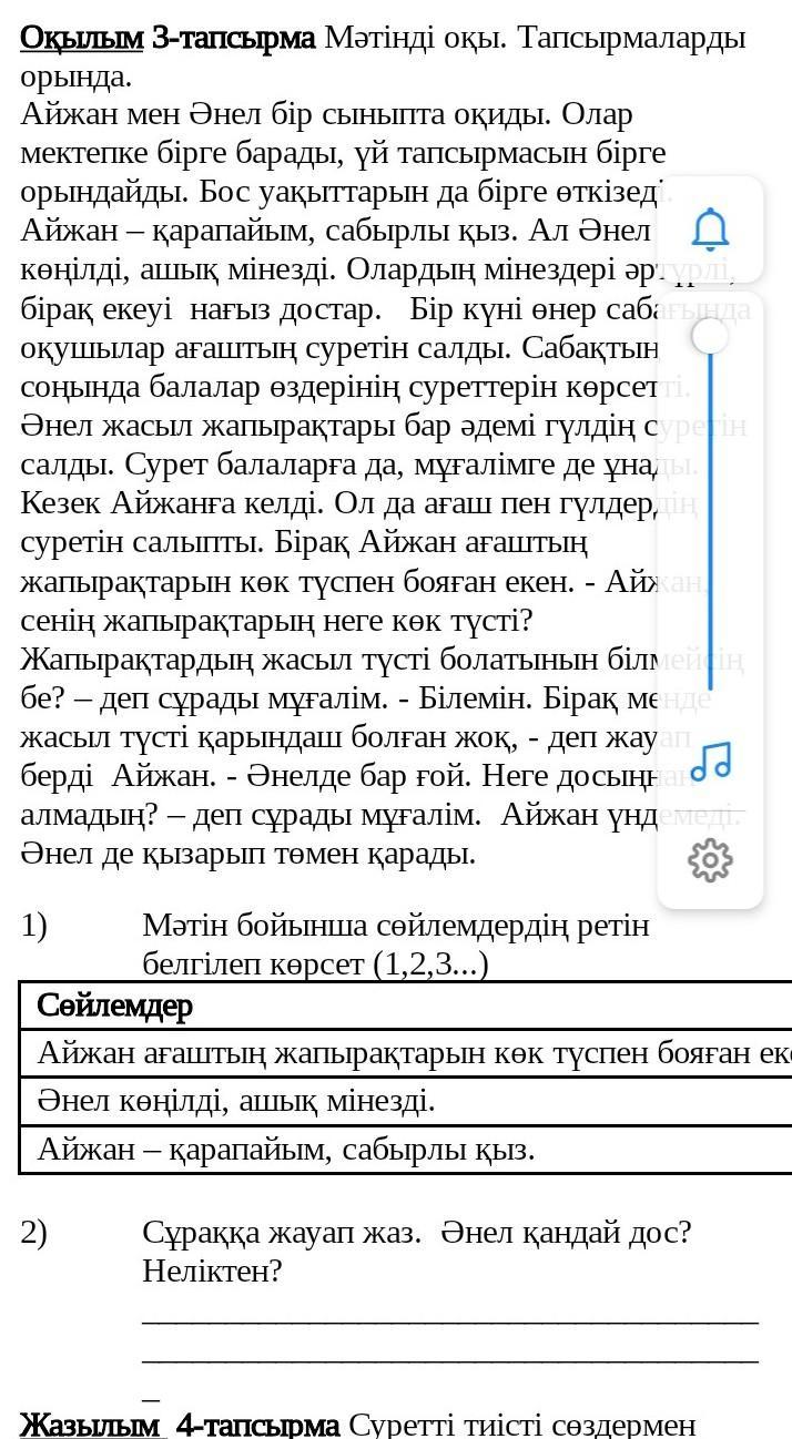 1 Айжан-қарапайым,сабырлы қыз.2 Әнел көңілді, ашық мінезді.3 Айжан ағаштың жапырақтарын көк түспен бояған...