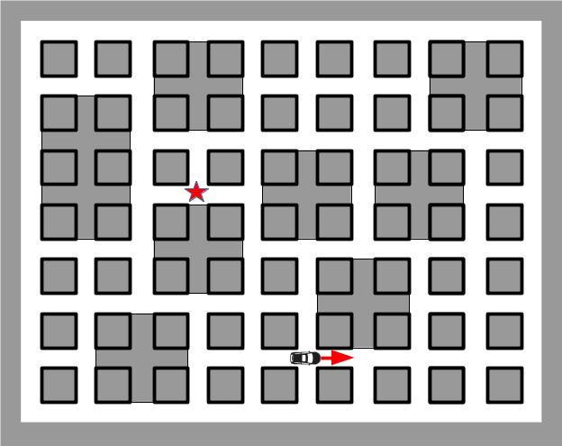 План города представляет собой прямоугольную сетку, в узлах сетки находятся перекрёстки, соединённые дорогами. Расстояние между перекрёстками равно 1. Но некоторые проезды между перекрёстками закрыты, передвигаться можно только по белым улицам (в том числе и по внешней белой границе), проезжать по серым улицам и перекрёсткам нельзя.