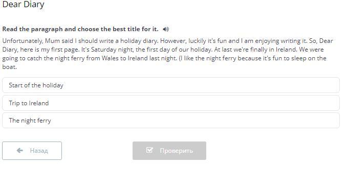 Dear Diary Read the paragraph and choose the best title for it. Unfortunately, Mum said I should write a holiday diary. However, luckily it's fun and I am enjoying writing it. So, Dear Diary, here is my first page. It's Saturday night, the first day of our holiday. At last we're finally in Ireland. We were going to catch the night ferry from Wales to Ireland last night. (I like the night ferry because it's fun to sleep on the boat. Start of the holiday Trip to Ireland The night ferry