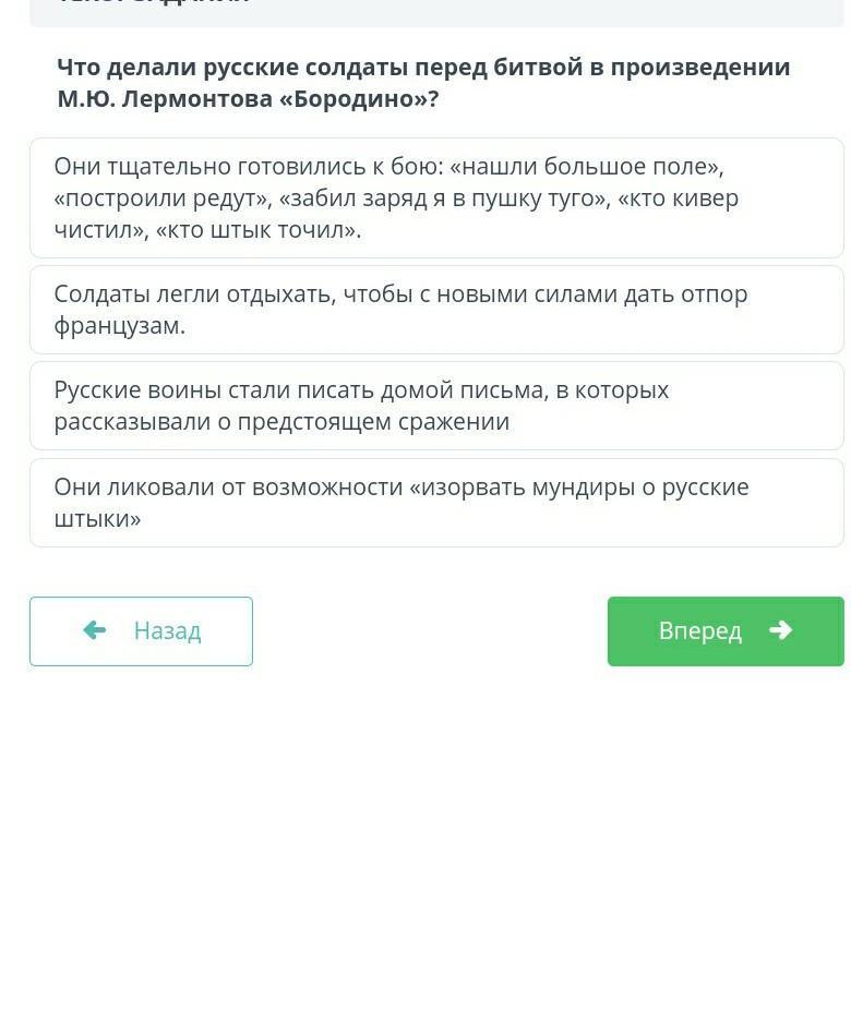 Они тщательно готовились к бою: «нашли большое поле», «построили редут», «забил заряд я в пушку туго», «кто кивер чистил», «кто штык точил»