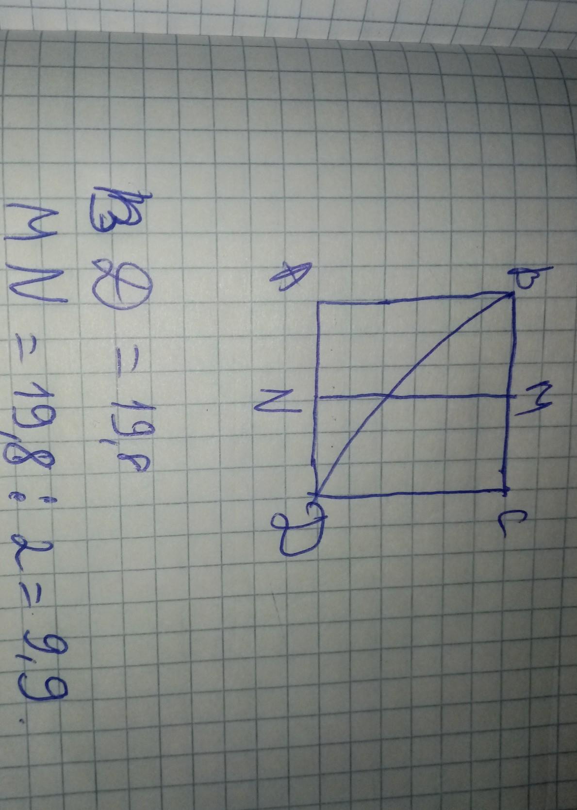 Через конечную точку D диагонали BD=19,8 ед. изм. квадрата ABCD проведена прямая перпендикулярно диагонали BD. Проведённая прямая пересекает прямые BA и BC в точках M и N соответственно.